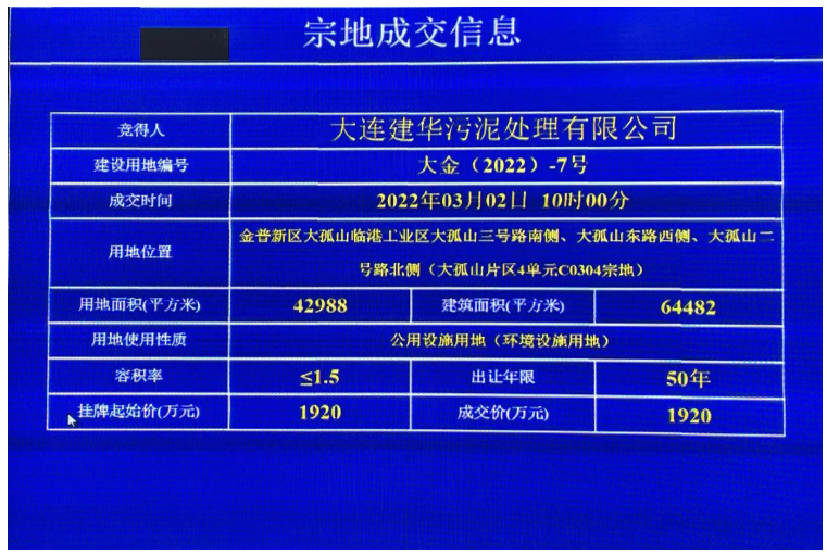 大连建华污泥处理有限公司于2022年3月2日上午10:00在大连市公共行政服务中心交易厅举办国有建设用地使用权挂牌出让活动中成功竞得大金(2022)-7号地块,规划用地面积42988平方米,其将作为建华污泥扩建项目建设用地。